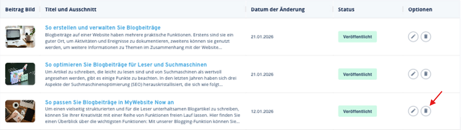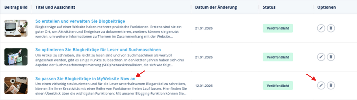 Wenn Sie bereits einen Beitrag erstellt haben, können Sie ihn auf der Übersichtsseite aufrufen, indem Sie auf die Überschrift des Beitrags oder auf das Stiftsymbol rechts in der Spalte klicken. Wenn Sie mehr über die Anpassungsmöglichkeiten in MyWebsite Now erfahren möchten, lesen Sie bitte unseren Blogbeitrag "Wie man Blogbeiträge in MyWebsite Now anpasst".