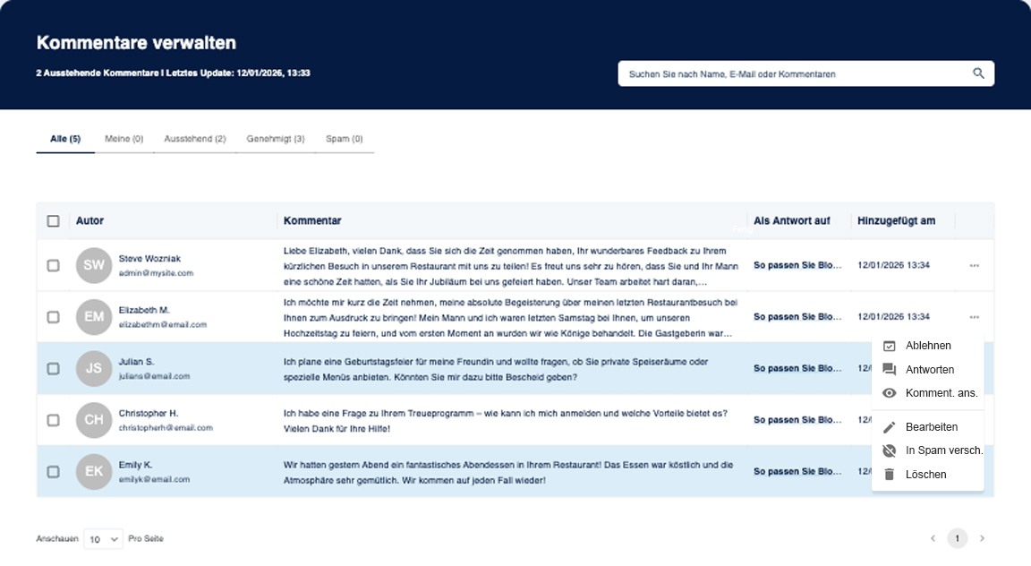 Für jeden Blogbeitrag haben Sie die Möglichkeit, die Kommentarfunktion für Ihre Besucher zu aktivieren oder zu deaktivieren. Bevor Kommentare veröffentlicht und unter Ihrem Beitrag sichtbar werden, müssen Sie sie nach Erhalt einer Benachrichtigungs-E-Mail überprüfen.